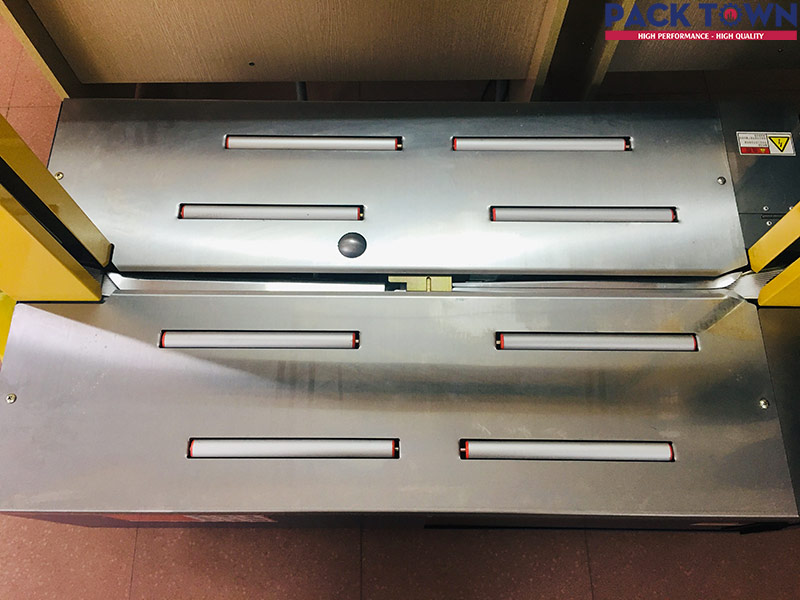 Máy được thiết kế 8 trục lăn, đặt xen kẽ nhau, dễ dàng dịch chuyển thùng hàng nặng tới vị trí đai mong muốn.